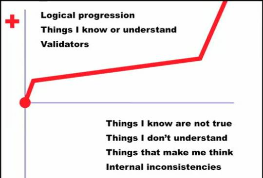 另外,有许多事情会给我泼冷水,降低我的情绪,你要能从这些东西中恢复过来。比如,你告诉我一件明显不真实的事情,像“我们没有竞争对手,从来没有人做过类似东西。”没准我就知道已经有人做过了,当你告诉我的一刹那,我对你说的所有话就开始有疑问了、任何让我怀疑,任何让我不理解,任何让我需要我自己去猜测的,都会让这个演讲不流畅。