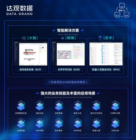 达观数据总部位于上海张江科学城,在北京、成都、深圳、郑州等地设立了分支机构,业务遍及全国。自2015年底创立以来先后获得真格基金、软银赛富、宽带资本等知名机构领投的连续三轮投资,企业经营业绩持续保持高速成长。达观在文本语义分析技术方面拥有100多项技术发明专利和软件著作权,利用该优势,结合自研的RPA机器人系统,达观为金融、制造、能源、电信、法律、地产、物流、政务、传媒等众多行业提供智能化处理软件,辅助或部分代替人类来自主完成文档内容审阅、资料比对、票据分析、表单填写、知识搜索、智能推荐等操作,大幅降本增效。