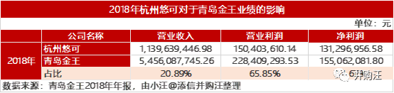 而青岛金王2017年的净利润只有4.45亿,收购悠可为其贡献了56%的净利润。2018年,悠可净利润占青岛金王净利润比重再次提高到85%。