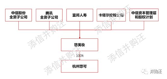 收购主体:杭州悠美妆科技开发有限公司,实际控制人为CITICCapital Holdings Limited (Hong Kong)(中信资本控股有限公司)。悠美妆于2019 年 2 月 12 日注册,是为了收购悠可专门设立的主体。