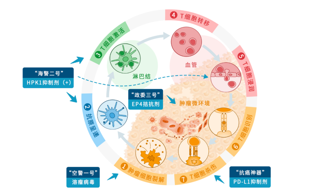 AN0025 目前即将开展 II 期临床实验,并已在华申报临床。同时,阿诺还和默沙东(MSD)达成合作,开发 AN0025 和 PD-1 抗体 Keytruda(帕博利珠单抗)在多种实体瘤适应症的联合用药。截至目前,阿诺已经布局了若干个研发管线,其中 3 个项目(溶瘤病毒 AN1004、EP4 拮抗剂 AN0025、PI3K 抑制剂 AN2025)进入临床阶段。这样的管线布局,也是基于阿诺内部对于肿瘤免疫疗法的形象化理解。PD-(L)1 只是肿瘤免疫治疗的其中一个节点,如果单独使用PD-(L)1抑制剂进行治疗,相当于还有多个关键环节没有被突破。目前,将这几个环节中的关键疗法分别与PD-(L)1抑制剂进行联用的临床试验数量众多,其中一部分已经公布了乐观的临床数据,如果能够将这些环节全部逐一攻克,进一步突破免疫抑制屏障,很可能意味着能够更强力地杀伤肿瘤细胞。何南海比喻道,如果把人体内的癌细胞比作一个狡猾的“敌人”,那么对于 PD-(L)1 在癌症治疗中响应率低的表现,一言以蔽之,它就像“一个特种兵(杀伤性 T 细胞)虽然有了一个‘克敌(抗癌)神器’(PD-(L)1 抑制剂),但在抓捕敌人的过程中还是再次迷路了”。此时,这个迷路的“特种兵”需要再次升级装备和更多“队友”紧密配合,用灵敏的 GPS 定位敌人的所在位置,以便抓获逃逸的敌人。在以往抓捕行动中,“陆军”司令部往往只会派出一到两名陆军特种兵来完成抓“敌”任务,也就是现阶段临床试验中常见的“ 1+1 ”联合用药。为了更形象地说明“ C 药”的本质,何南海博士从阿诺的数个在研管线中,挑选出溶瘤病毒、HPK1 抑制剂 (+)、EP4 拮抗剂和口服 PD-L1 抑制剂四个项目展开阐述。“目前 PD-(L)1 抑制剂已经得到了很好的临床验证,因此我们选择在 PD-(L)1 抑制剂的基础上全面且系统性地调动免疫反应,以最大限度降低肿瘤免疫逃逸的几率。也就是说我们组建的以手持“克敌神器”特种兵(杀伤性 T 细胞)为主的“海、陆、空”三位一体的“克敌(抗癌)”团队,会让癌细胞无处躲藏。”溶瘤病毒——“溶瘤病毒能够特异性地定位并杀死肿瘤细胞,引起肿瘤细胞的破裂而会释放出更多抗原,从而刺激抗肿瘤免疫反应。”何南海博士介绍道。溶瘤病毒这个“空警一号”不但可以精确定位肿瘤细胞,同时还可以定点空投炸弹,让癌细胞这个“敌人”暴露出更多“马脚”,无处躲藏。溶瘤病毒对癌细胞的裂解作用,是接下来一系列 “蝴蝶效应”(免疫反应)的开始。阿诺的溶瘤病毒制品 Pelareorep,目前已获批开展 III 期临床实验。HPK1 抑制剂 (+)——“在溶瘤病毒裂解肿瘤细胞之后,免疫‘巡逻兵’才有机会找到肿瘤细胞,并且将信息处理、传达给‘司令部’。而我们的‘海警二号’ HPK1 抑制剂 (+) 投送升级装备给‘巡逻兵’,让它们有更强大的寻找、处理并传达肿瘤相关信息的能力。”何南海博士介绍道,“作为当前热门的免疫靶点之一,HPK1 抑制剂对抗原呈递细胞有很好的促进作用。不但如此,我们还给 HPK1 抑制剂赋予了更多的功能,甚至可以帮助特种兵‘抢滩‘肿瘤的大本营(肿瘤浸润)。由于不便透露更多信息,故在此用 (+) 来表示除 HPK1 抑制功能外的‘神秘能力’。”“通过‘溶瘤病毒’和‘HPK1 抑制剂 (+)’的协同作用,越来越多的关于这个‘敌人’的信息被披露,让特种兵‘克敌’底气十足。”何南海介绍道。EP4 拮抗剂——“肿瘤在形成过程中,会不断地用‘糖衣炮弹’来侵蚀一些‘思想’不够坚定的免疫细胞来为肿瘤所用。而 EP4 抑制剂就像是善于做思想工作的‘政委’,让免疫细胞彻底清醒过来,为‘克敌’创造最为有利的环境。”何南海博士说道。口服 PD-L1 抑制剂——在各方面准备就绪后,克敌收网行动迫在眉睫。“特种兵”手持耳熟能详的 PD-L1 抑制剂登场。PD-(L)1 信号通路自此阻断,T细胞的杀伤活性增强,“敌人”正式落网。对此,何南海博士透露,目前阿诺的口服 PD-L1 抑制剂项目即将进入临床阶段。如果以往的 PD-(L)1 治疗策略偏向于孤军奋战或单一联合作业,何南海把阿诺的策略比作立体式打击。阿诺不仅要覆盖溶瘤病毒、HPK-1 抑制剂 (+)、EP4 拮抗剂项目和免疫检查点抑制剂这 4 个关键节点,还要将 4 个节点融合成一个整体。如此看来,阿诺确实在开发多种治疗方案以解决目前治疗不足的疾病上方面取得了显著进展,其主要项目拥有较大的潜在价值,但是否能够开创全新的癌症治疗范式,还有待进一步的关注。