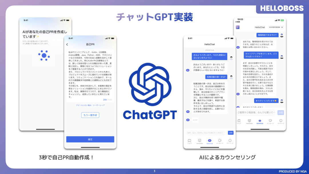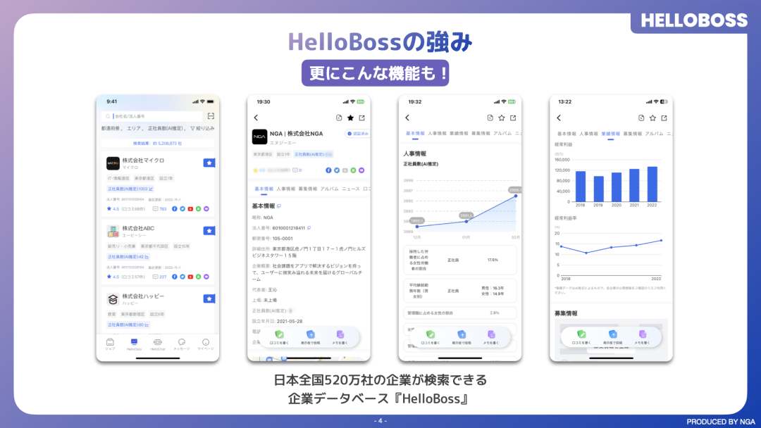 比如“快”,日本现在招人都是留一个电话或者邮箱在海报上,而 HelloBoss 只需要一个二维码,应募者就可以在线快速进行文字直聊。最近「HelloBoss」集成了 Chat-GPT,不只个人可以通过 ChatGPT 自动生成自我介绍,企业也可以通过其自动生成招募信息。配合自研的企业大数据, HelloBoss 可以自动化完成企业的真实性验证,最快仅需 5 分钟就可以帮企业完成从注册、登载招人信息、进行企业验证的流程。而这一流程之前可能需要 2 周,这极大地减少了人力成本。