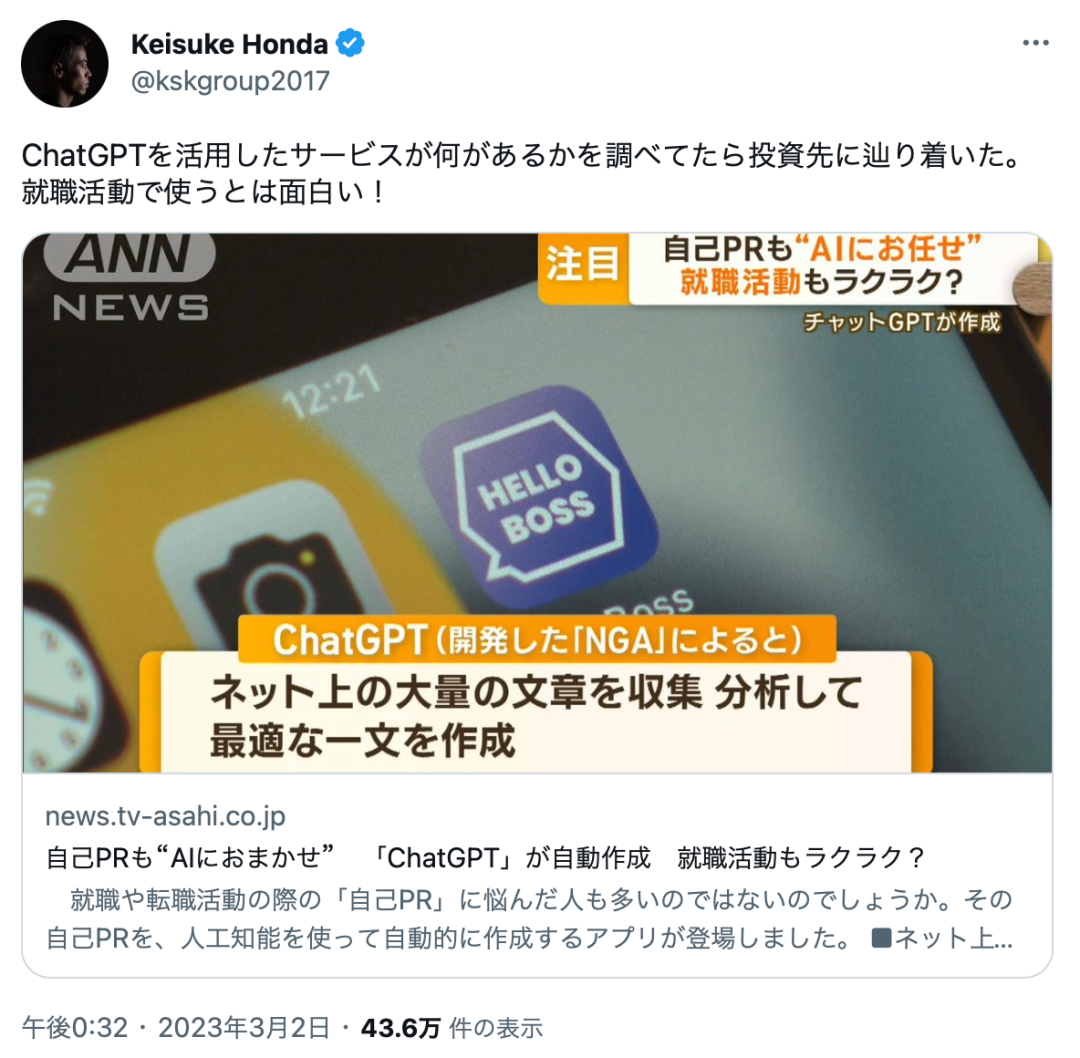 ③营销的话我们会紧跟话题,让工程团队快速迭代产品功能,获得媒体曝光机会。比如 HelloBoss 是日本最早在产品中集成 ChatGPT 的 HR 产品。上线这个功能后就获得了日本 5 大电视台朝日新闻与最大的网络媒体 ABEMA 等机构的介绍。同时 HelloBoss 的天使投资人本田圭佑也是日本创投圈最大的 KOL,一个推特帖子就获得了 40 万阅读,这一套组合下来就让 HelloBoss 的单日新增用户涨了 30 倍。