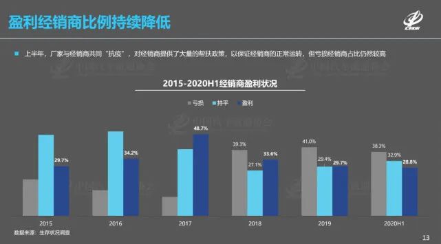2020上半年,经销商的经营压力继续加大。数据显示,仅有28.8%的经销商实现盈利,较去年下降0.9个百分点。