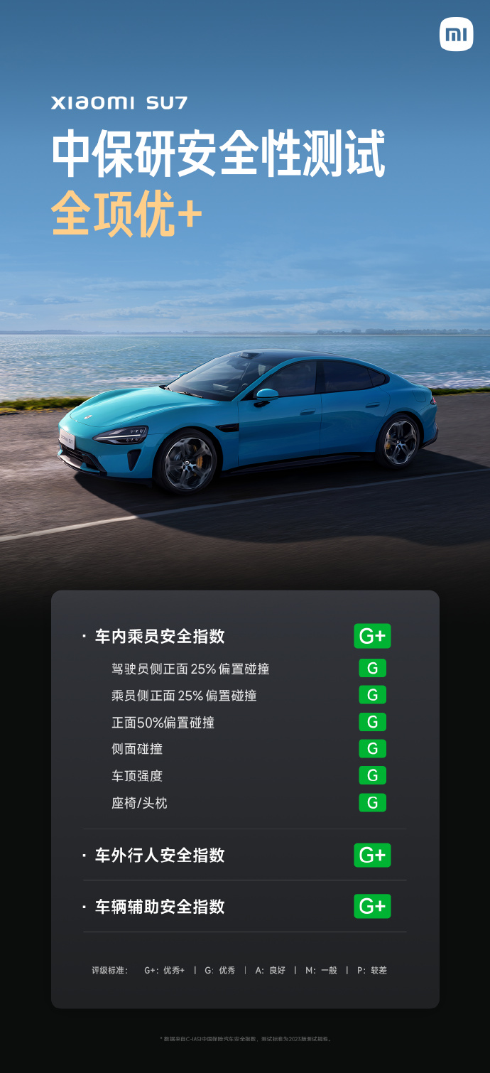 2024 年 9 月 5 日,2024 年中国保险汽车安全指数(C-IASI)成绩公布,小米 SU7 在车内乘员安全、车外行人安全、车辆辅助安全,三大安全性测试均获最高等级 G+,安全性测试全项优+!