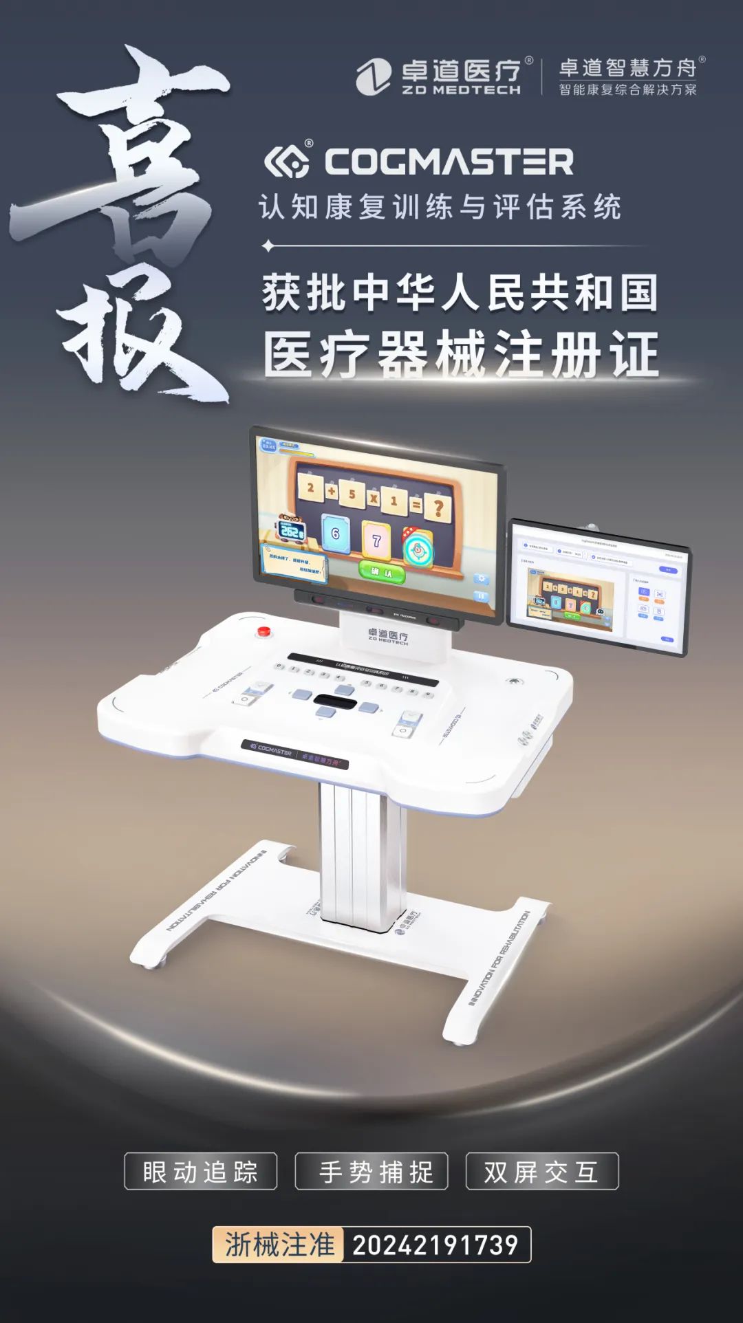 近日,卓道医疗宣布 CogMaster® 认知康复训练与评估系统获中华人民共和国医疗器械注册证。