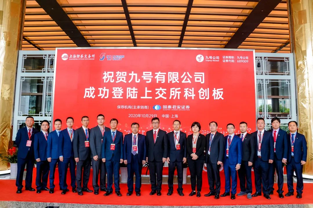 上市现场,九号公司Segway配送机器人S2完成敲钟,首开A股机器人鸣锣上市先河。10月29日,智慧移动能力公司九号有限公司(证券简称“九号公司”)在上海证券交易所科创板正式上市,成为中国境内上市企业中“VIE+CDR”第一股,红杉中国为企业最大外部机构投资人。上市首日,九号公司的开盘价为33元/份,较发行价18.94元/份上涨74.23%,开盘后,九号公司股价最高涨幅超100%,市值超 230 亿。上市现场,九号公司将仪式交给了其Segway配送机器人S2完成,首开A股机器人鸣锣上市先河。九号公司是一家专注于智能短交通和服务类机器人领域的创新企业,依托企业研发创新优势和扎实的制造实力,企业开发了包括智能电动平衡车、智能电动滑板车、智能两轮电动车、智能服务机器人等一系列产品,成为电动车智能化潮流引领者。九号公司董事长兼CEO高禄峰在上市致辞中表示:“8年前,九号公司的创始团队带着‘用科技改变人类出行’的梦想推开了智能短交通的大门。现在,九号公司已成功走向世界,在国际竞争中淬炼成长为全球化科技企业。上市对我们来说是新的起点和契机。”九号公司董事长兼CEO高禄峰(左九)、九号公司联合创始人总裁王野(左十)与红杉中国投资副总裁王昊(左六)在上市现场。