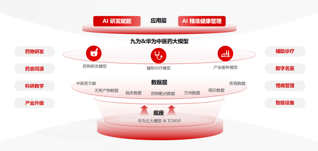 九为健康基于自有TCMSP平台与华为联创中医大模型,布局AI研发赋能及AI精准中医健康管理两大业务方向,赋能中医药全产业链,实现研发、诊疗、健康管理全流程健康服务智能升级。目前九为健康已完成生态布局,并在多领域应用落地完成商业验证。