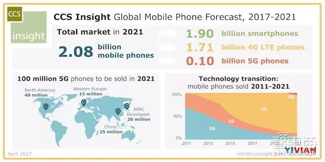 4月13日,全球市场分析机构CCS Insight发布了关于全球手机出货量预测的最新报告。CCS Insight估计,2017年的手机出货量为20亿台,比2016年上涨2%。预计全球需求将以这一速度持续下去,未来五年内的出货量将达到惊人的100亿台。