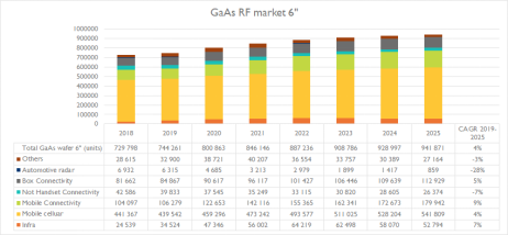 Yole预测,从2019年到2025年,GaAs wafer 6"消耗量将保持4%的复合年增长率,晶圆需求量从74.4万片/年增加到94.1万片/年。