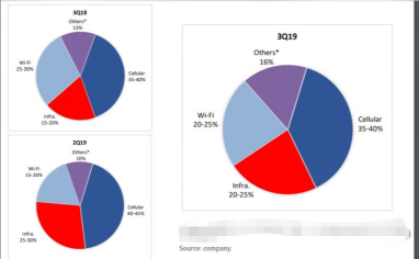 2019年,路由器主芯片开始集成5.8GPA,WIFIPA需求减少。手机上,除了苹果继续采用Murata的砷化镓WIFIPA,其他手机厂商已经转向SiGe工艺的WIFIFEM,因此2019年前两季度WIFIPA所需的砷化镓晶圆下降。随着WIFI6的到来,砷化镓WIFIPA的需求大幅增加,对应的砷化镓晶圆消耗量在2019年Q3季度又占到20-25%,比手机PA少了15个百分比,手机PA占比为35-40%。