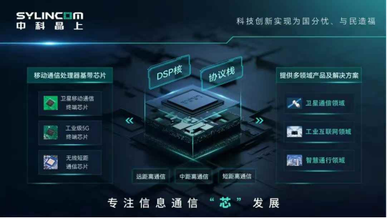 中科晶上秉承科技创新实现为国分忧,与民造福的理念,瞄准全球信息通信领域战略新兴产业发展,以高性能通信专用数字信号处理器内核领域的技术创新为基础,逐步突破了移动通信终端核心基带芯片设计关键技术,形成了高低轨卫星移动通信终端基带芯片、工业级5G终端基带芯片、星闪新无线短距通信芯片等系列支撑信息产业发展的核心芯片,已形成面向卫星互联网、工业互联网、智慧通行、消费电子等领域应用的系列产品及系统解决方案。