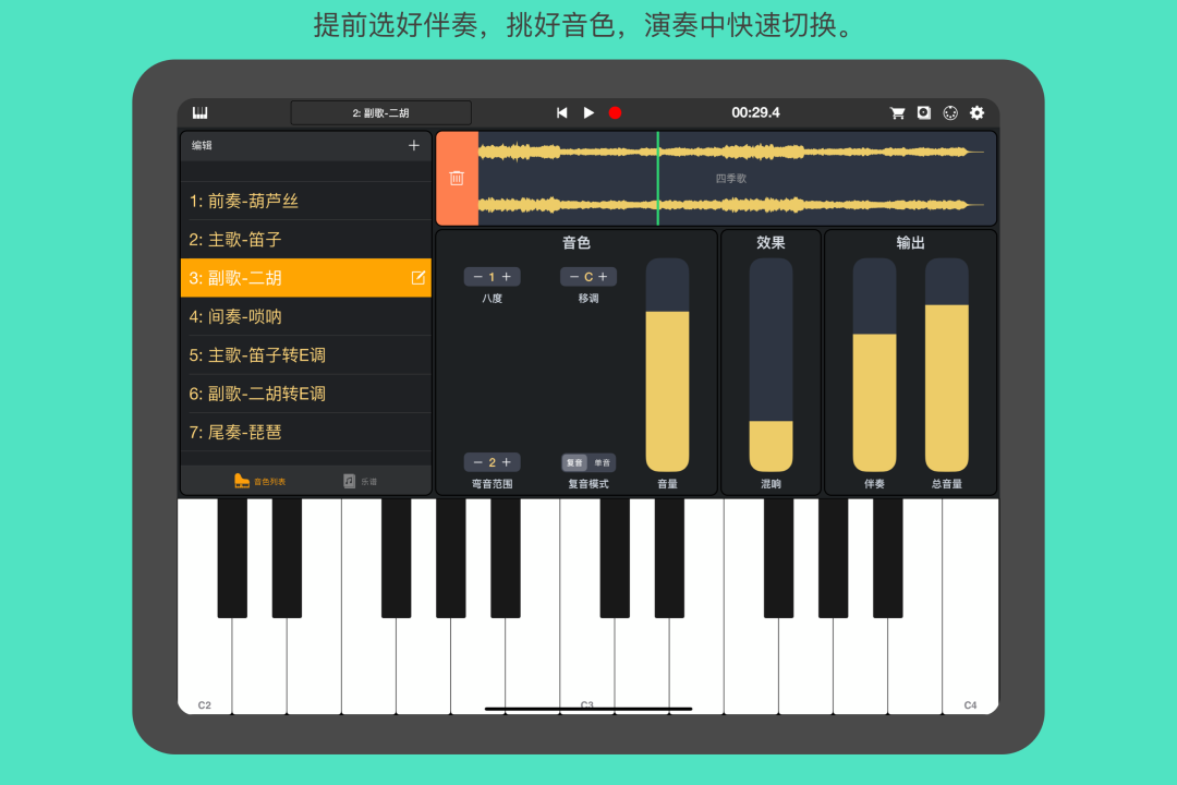 第一、丰富的民乐音源。目前,在自乐班APP的海内外用户比例中,国内用户超过70%。他们对民乐是非常喜欢的,主要付费的部分也是民乐类。为此,自乐班选择与Kong Audio合作,站内包含老年人比较喜爱的笛子、唢呐、二胡、葫芦丝等用户最喜爱的民乐器采样,陆续会有几十种民族乐器音色在站内发布。