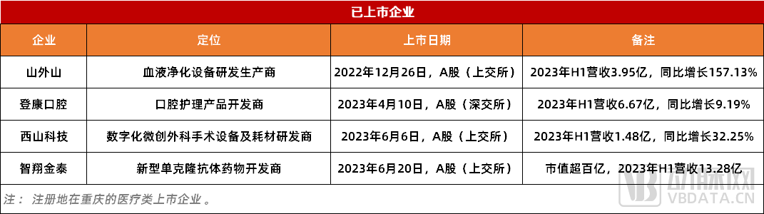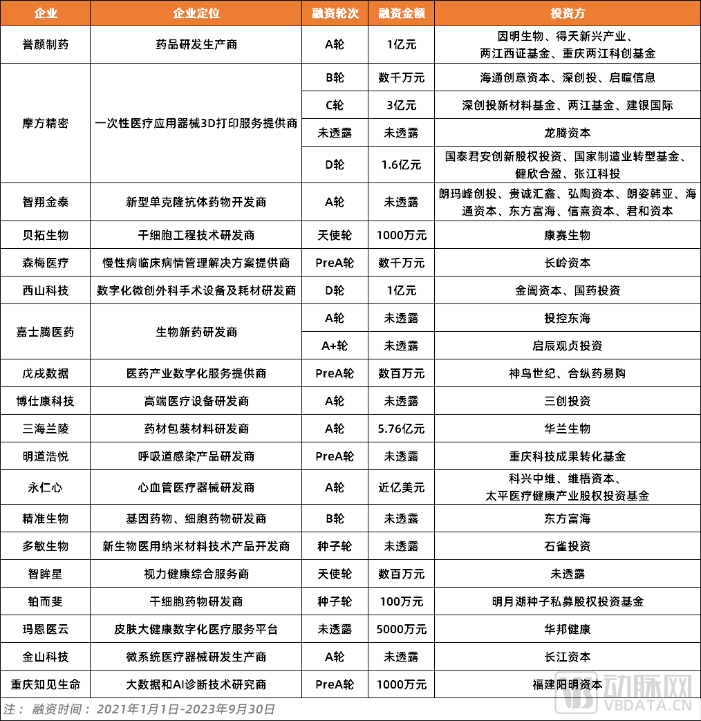 图1. 近一年重庆医药板块上市企业(数据来源:公开资料)以二级市场为例,在近一年的时间里,重庆已有四家医药企业成功上市,分别是山外山、登康口腔、西山科技以及智翔金泰,其中国产血液净化龙头山外山还是重庆第一个科创板IPO。当然,热闹的不只是二级市场,一级市场同样有高光表现。据动脉橙数据库不完全统计,在过去一年半的时间里,重庆医药领域共完成24起融资,融资总额超过30亿元,其中一次性医疗应用器械3D打印服务提供商摩方精密接连完成3轮融资,总融资额超过5亿。不过,从整体融资体量来看,重庆现阶段在医药领域与北上广深苏还是有明显差距,并且在以成都、南京、武汉、长沙、合肥为代表的新一线城市中,重庆目前也没有太大优势。但如果与自身相比,无论是在融资事件数还是融资金额,重庆都有明显提升,并且这还是在整个医药市场集体遇冷的大前提下。