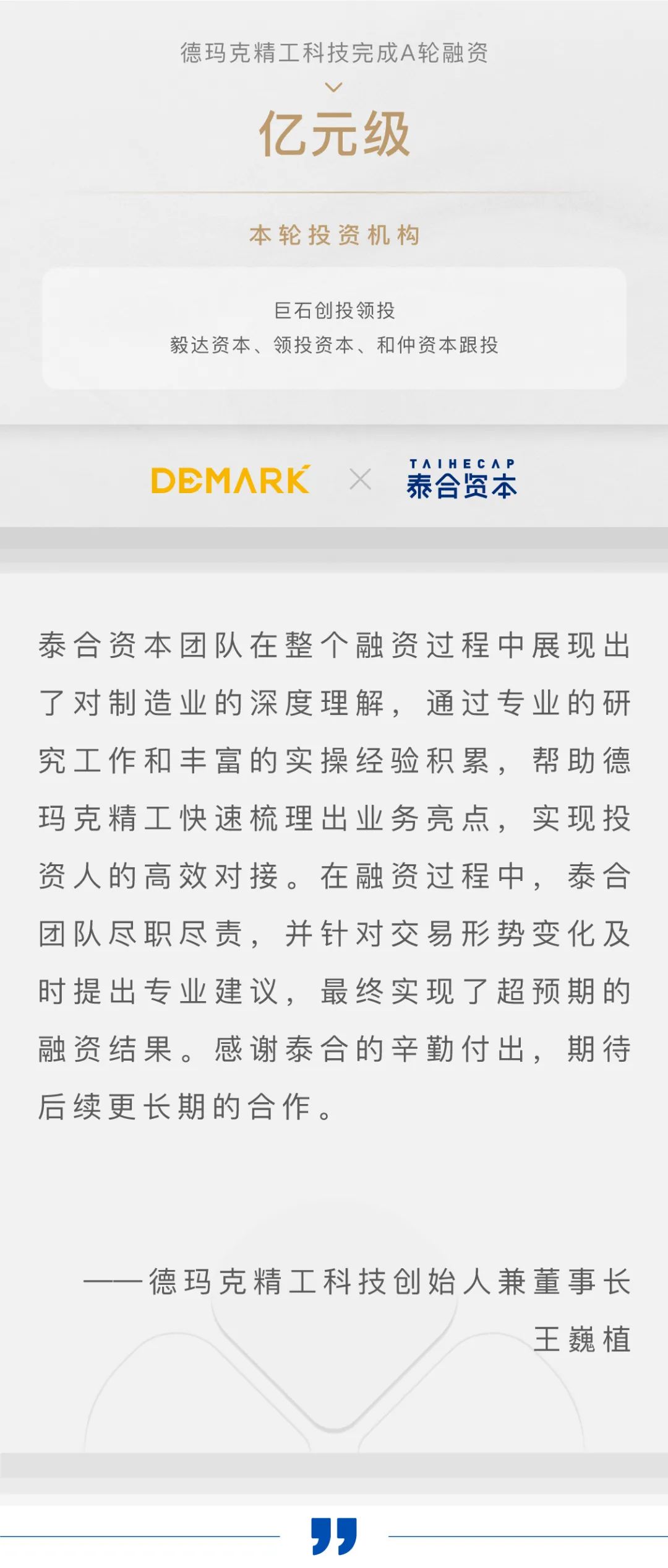 泰合资本董事陶军表示:我国高端装备制造领域即将迎来高速发展,而精密零部件的自主供应现阶段亟需加强。德玛克精工正是目前稀缺的具备完整底层制造能力的优质标的。我们很荣幸能够帮助公司完成本轮融资,期待未来与德玛克精工共同见证国产化制造的崛起。